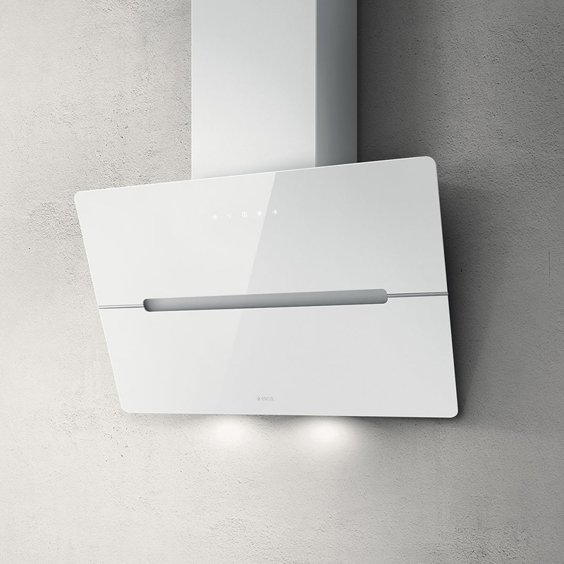 Elica Wise се предлага в черно и бяло стъкло, 60 и 90 см ширина. Аспираторът е с мощна концентрация на налягане в периметъра на засмукване.
