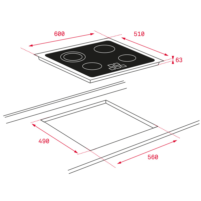 - Четири готварски зони: една зона (Ø 210 мм – 2,1 kW),една зона (Ø 180 мм – 1,8 kW),две зони (Ø 145 мм – 1,2 kW)